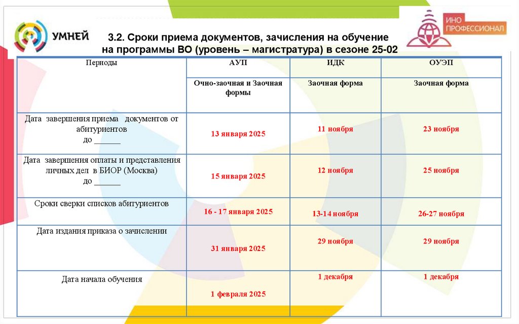 3.2. Сроки приема документов, зачисления на обучениена программы ВО (уровень – магистратура) в сезоне 25-02