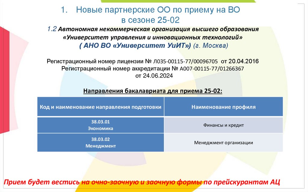 Новые партнерские ОО по приему на ВО в сезоне 25-02.