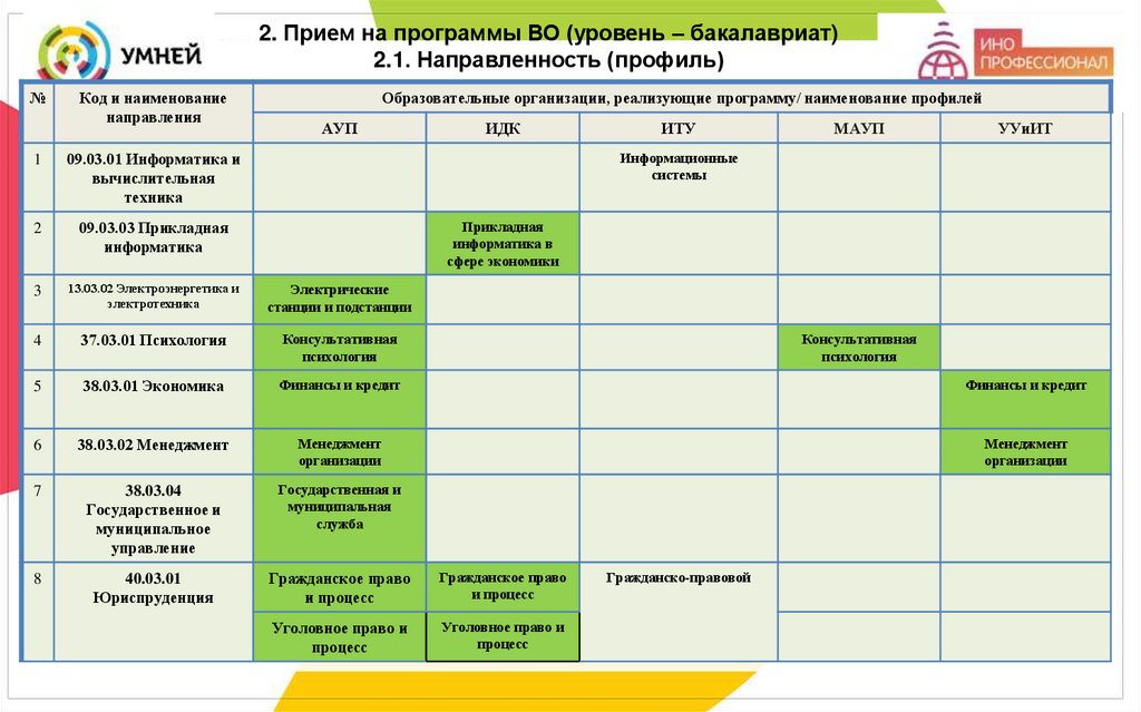 2. Прием на программы ВО (уровень – бакалавриат)2.1. Направленность (профиль)