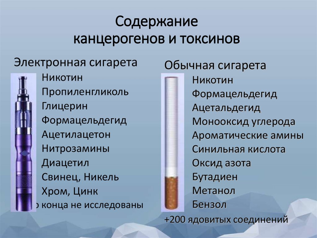 • Аэрозоли ЭС содержат высокотоксичный никотин и другие