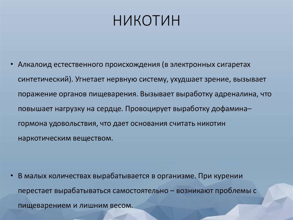 НИКОТИН• Алкалоид естественного происхождения (в электронных сигаретах