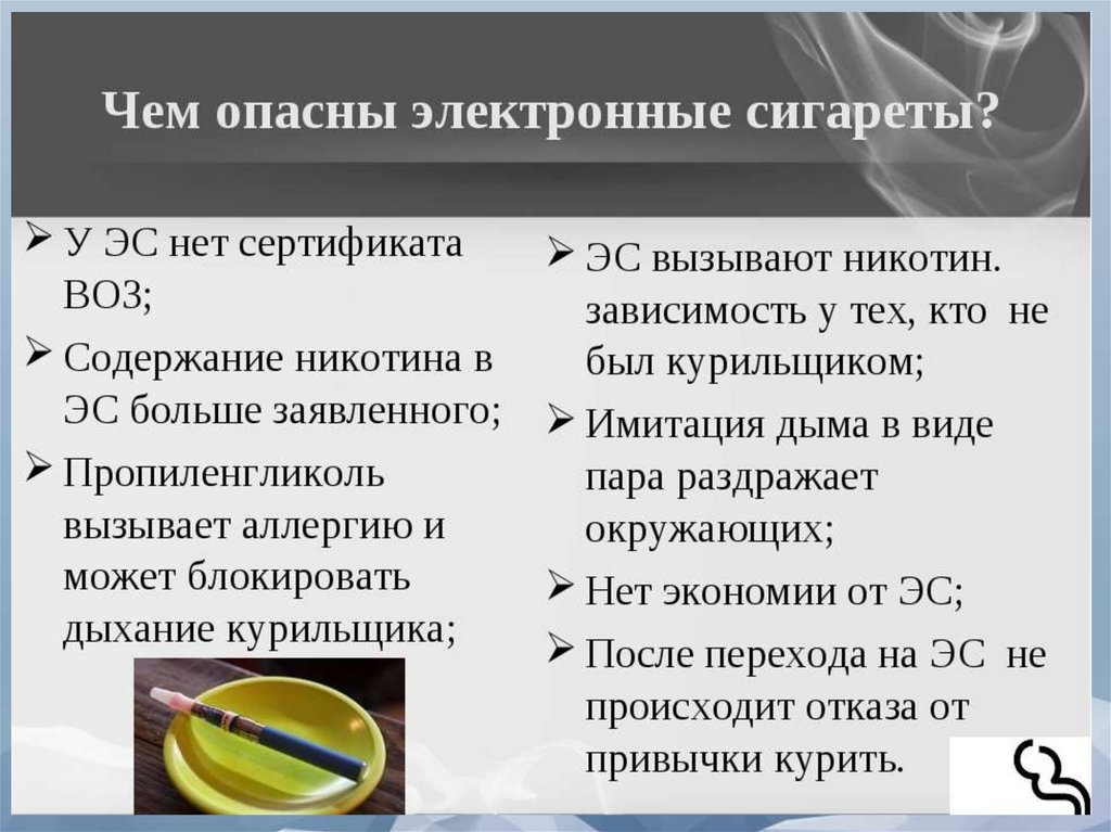 • Курить ЭС в местах, запрещенных для курения, нельзя, т.к.