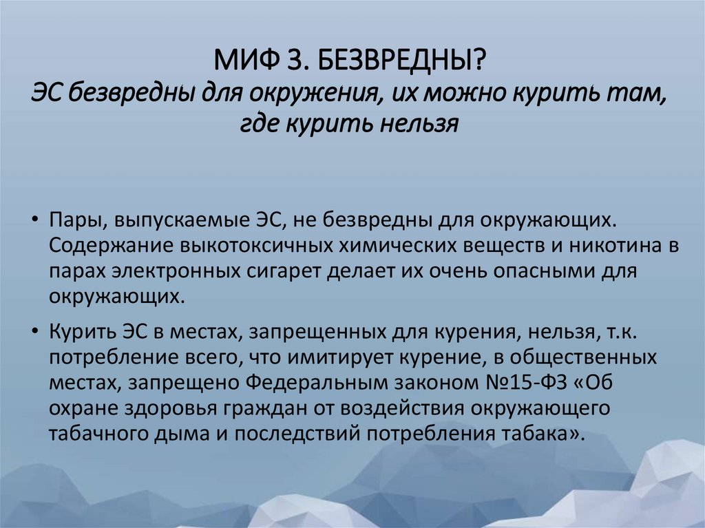МИФ 3. БЕЗВРЕДНЫ?ЭС безвредны для окружения, их можно курить там,