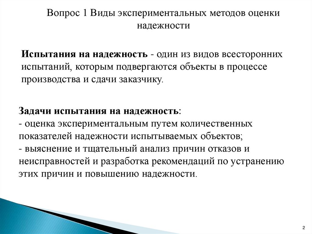 Вопрос 1 Виды экспериментальных методов оценкинадежности