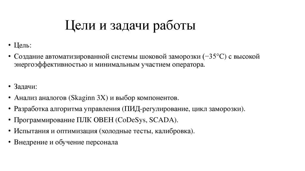 • Создание автоматизированной системы шоковой заморозки (−35°C) с высокой