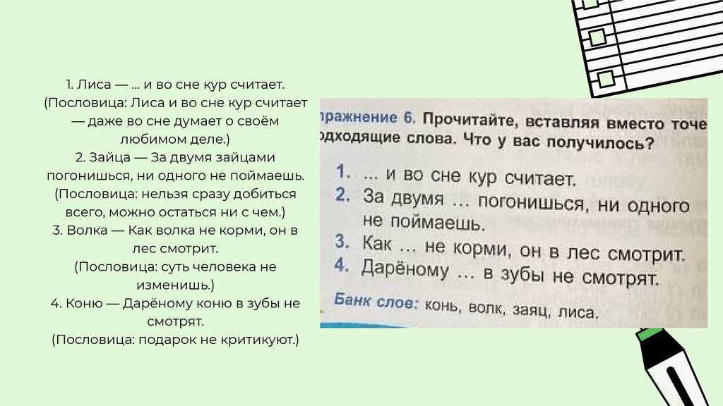 1. Лиса — … и во сне кур считает.(Пословица: Лиса и во сне кур считает