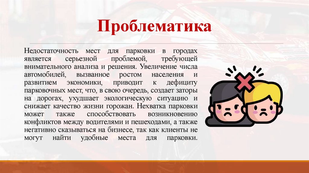 ПроблематикаНедостаточность мест для парковки в городах
