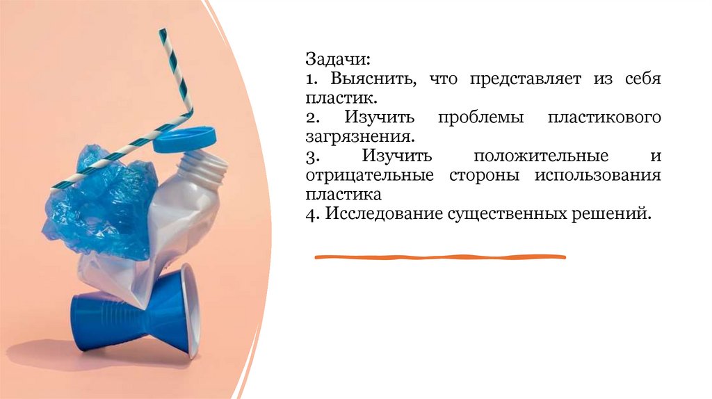 2. Задачи: 1. Выяснить, что представляет из себя пластик. 2. Изучить проблемы пластикового загрязнения. 3. Изучить положительные и