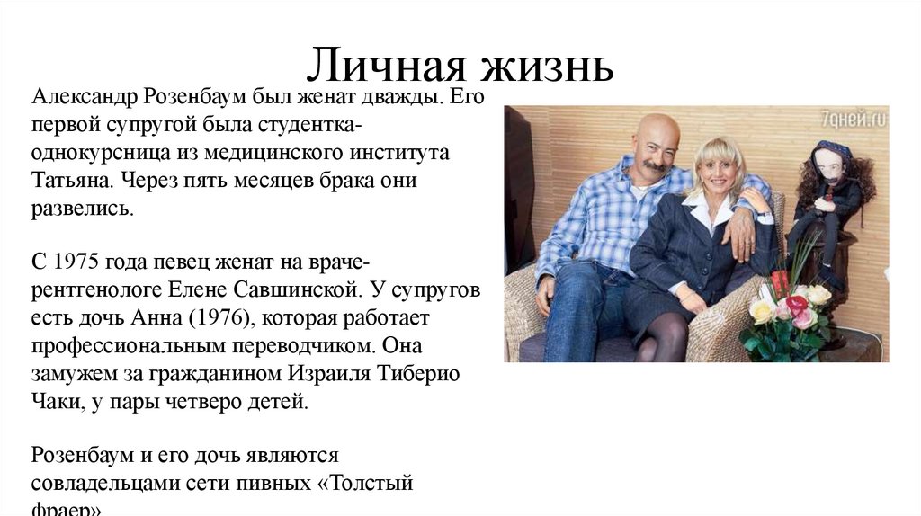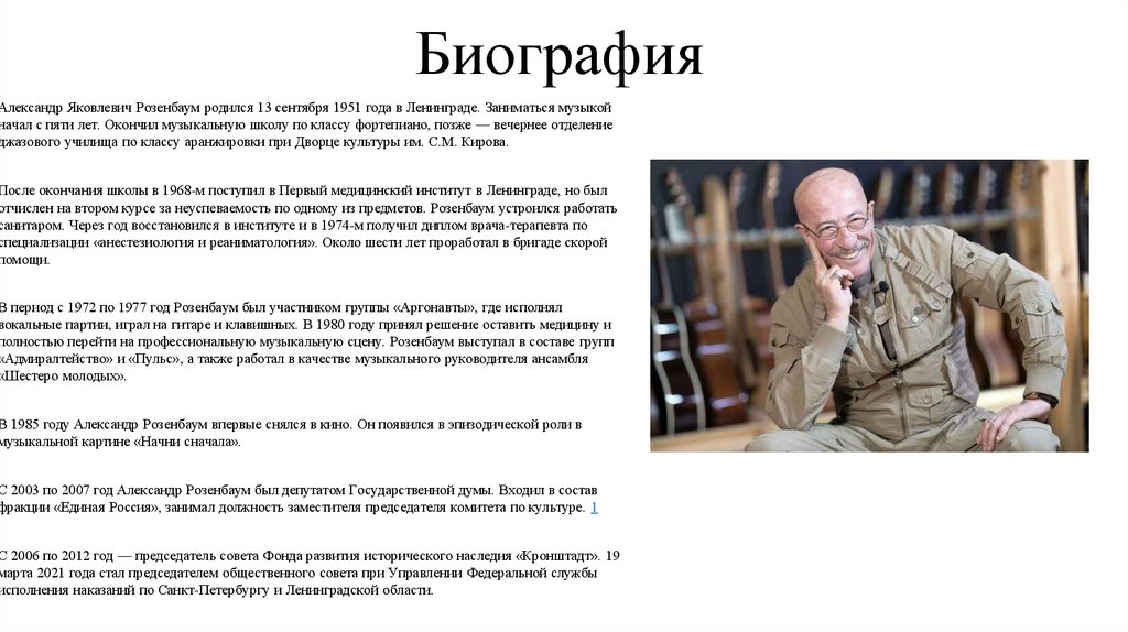 БиографияАлександр Яковлевич Розенбаум родился 13 сентября 1951 года в Ленинграде. Заниматься музыкой