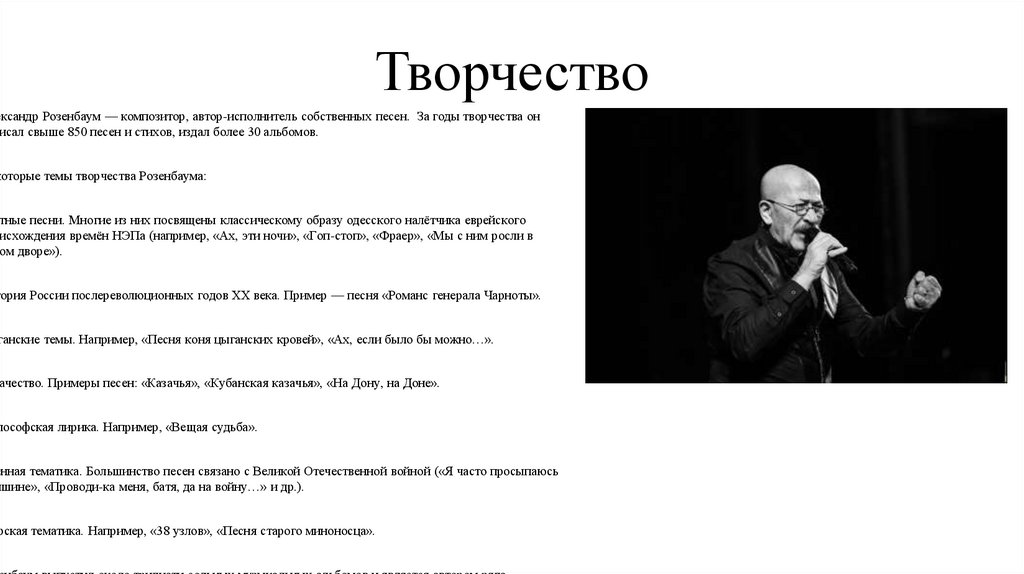 Творчествоександр Розенбаум — композитор, автор-исполнитель собственных песен. За годы творчества он