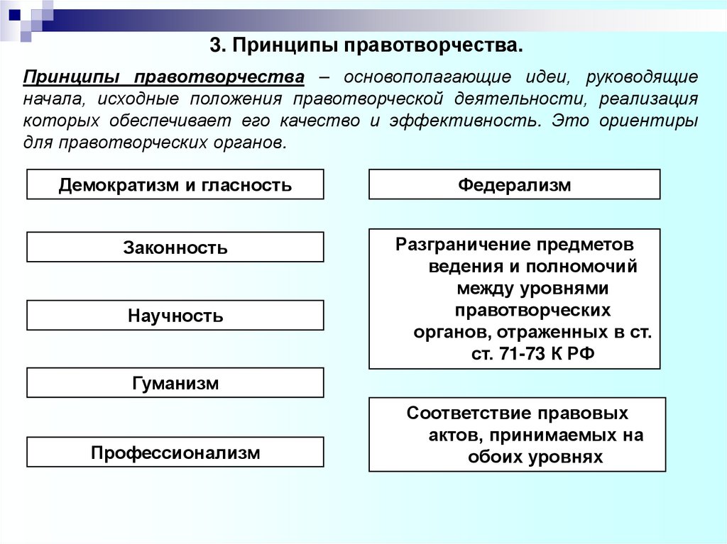3. Принципы правотворчества.Принципы правотворчества – основополагающие идеи, руководящие