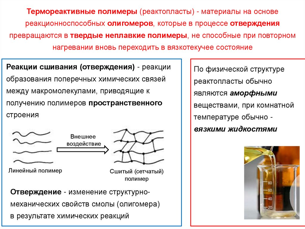 Термореактивные полимеры (реактопласты) - материалы на основереакционноспособных олигомеров, которые в процессе отверждения