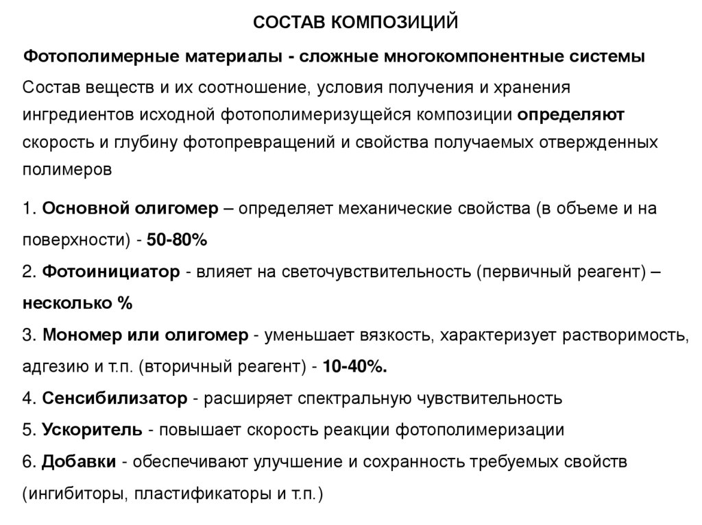 • увеличение содержания эпоксидных смол снижает светочувствительность