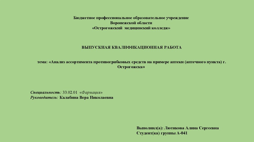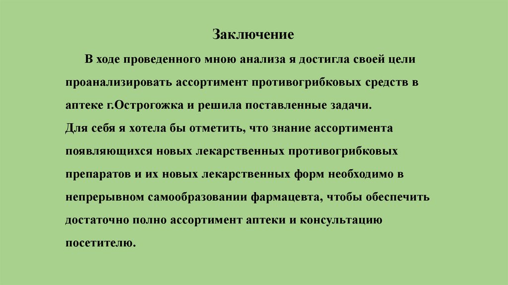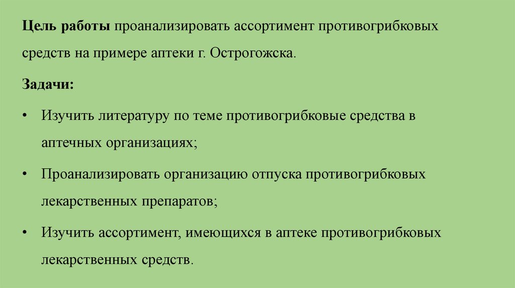 Цель работы проанализировать ассортимент противогрибковыхсредств на примере аптеки г. Острогожска.