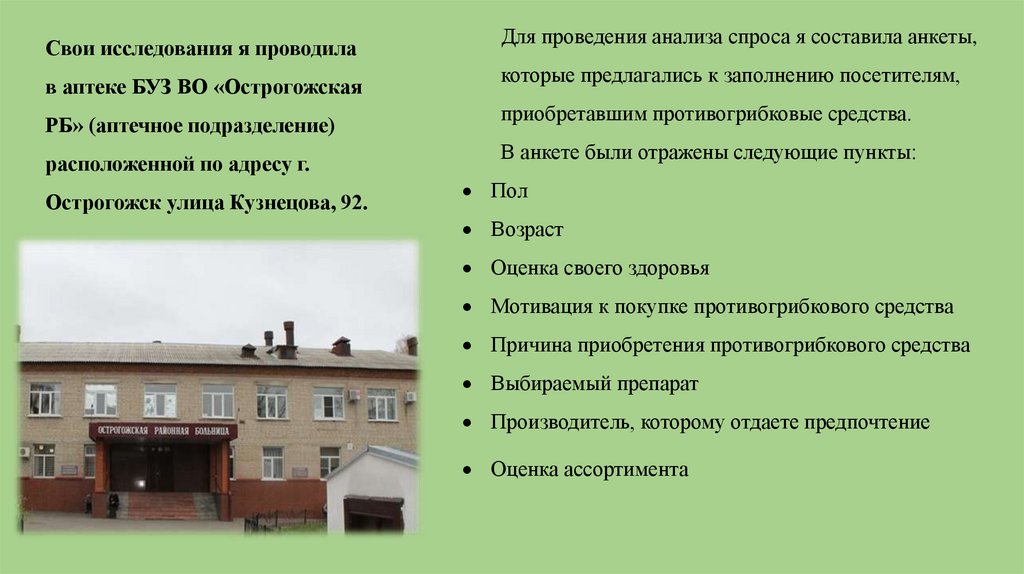 Свои исследования я проводилав аптеке БУЗ ВО «Острогожская