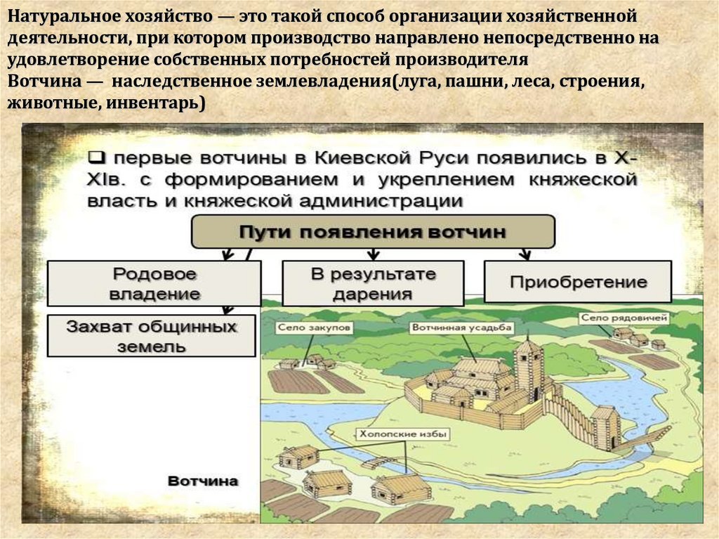 Вотчина — наследственное землевладения(луга, пашни, леса, строения,