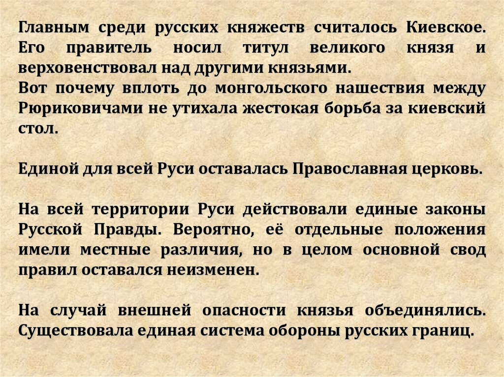 Главным среди русских княжеств считалось Киевское.Его правитель носил титул великого князя и