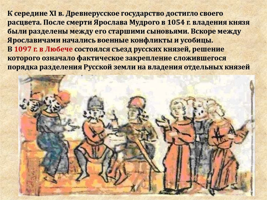 К середине XI в. Древнерусское государство достигло своегорасцвета. После смерти Ярослава Мудрого в 1054 г. владения князя