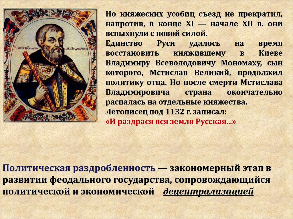 Но княжеских усобиц съезд не прекратил,напротив, в конце XI — начале XII в. они