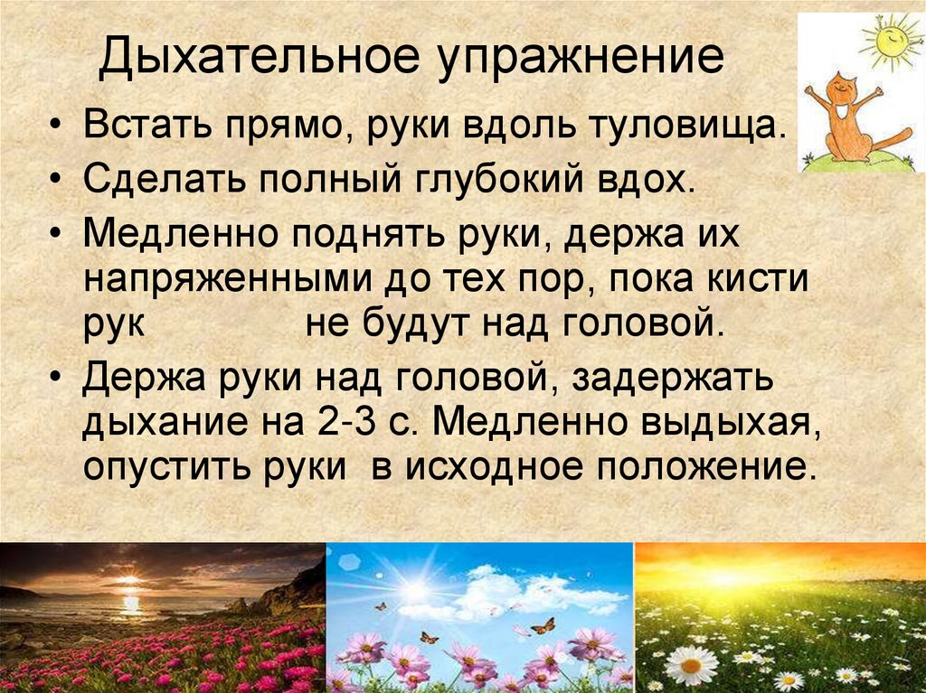 • Встать прямо, руки вдоль туловища.• Сделать полный глубокий вдох.