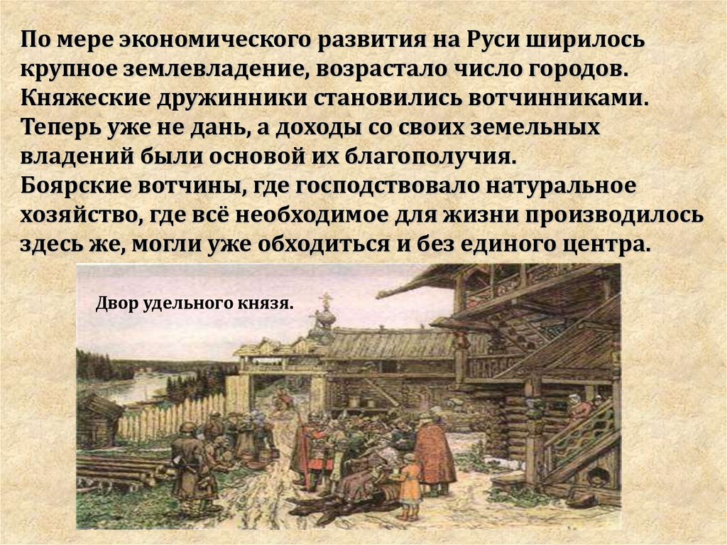 По мере экономического развития на Руси ширилоськрупное землевладение, возрастало число городов.