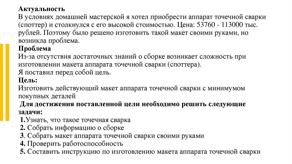 2. Актуальность В условиях домашней мастерской я хотел приобрести аппарат точечной сварки (споттер) и столкнулся с его высокой