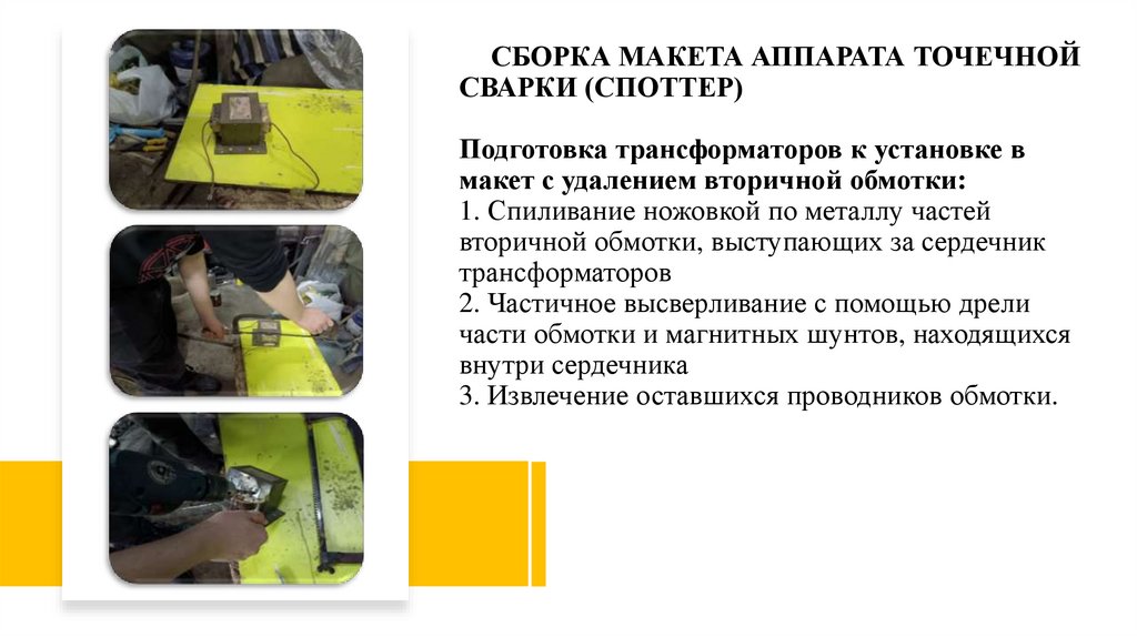 4. СБОРКА МАКЕТА АППАРАТА ТОЧЕЧНОЙ СВАРКИ (СПОТТЕР) Подготовка трансформаторов к установке в макет с удалением вторичной обмотки: