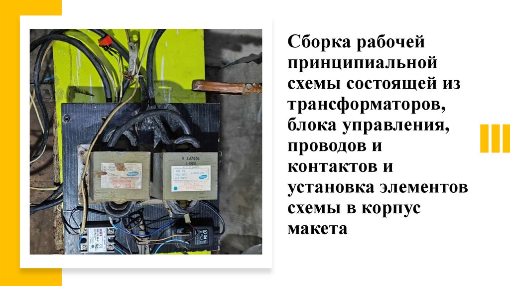 6. Сборка рабочей принципиальной схемы состоящей из трансформаторов, блока управления, проводов и контактов и установка элементов