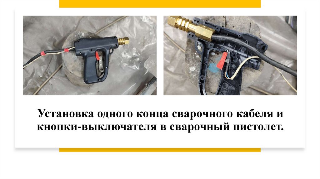 7. Установка одного конца сварочного кабеля и кнопки-выключателя в сварочный пистолет.