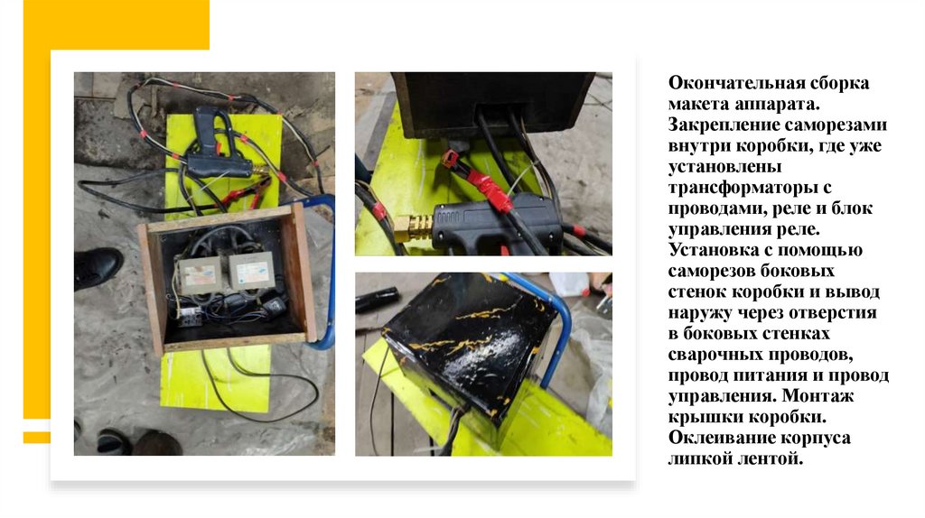 9. Окончательная сборка макета аппарата. Закрепление саморезами внутри коробки, где уже установлены трансформаторы с проводами,