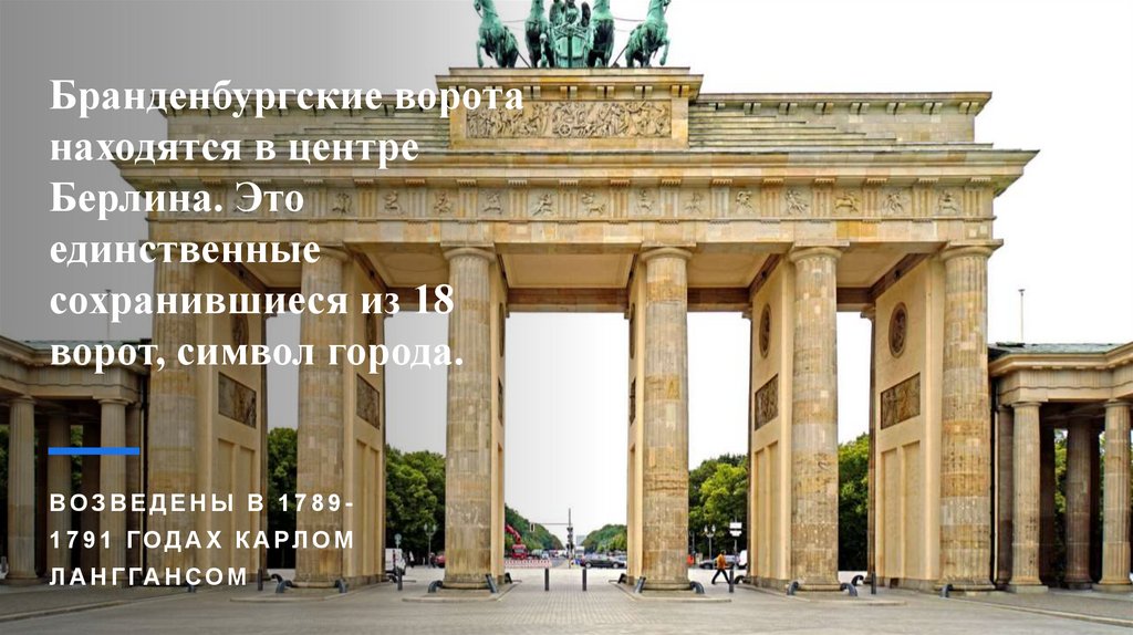 1. Бранденбургские ворота находятся в центре Берлина. Это единственные сохранившиеся из 18 ворот, символ города.