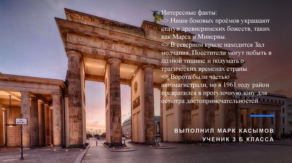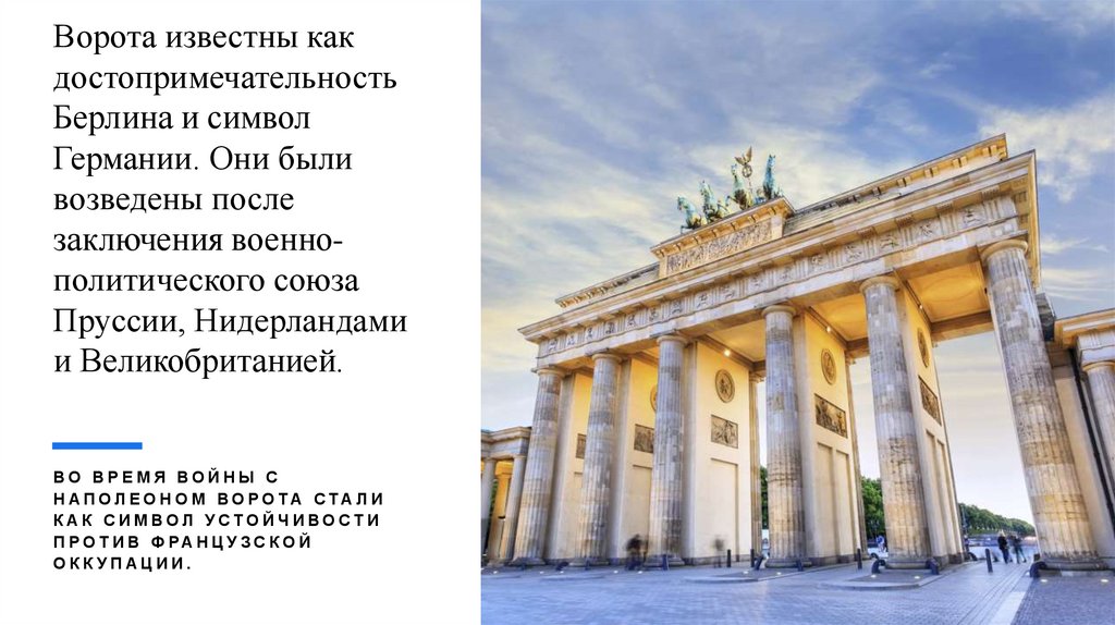 2. Ворота известны как достопримечательность Берлина и символ Германии. Они были возведены после заключения военно-политического