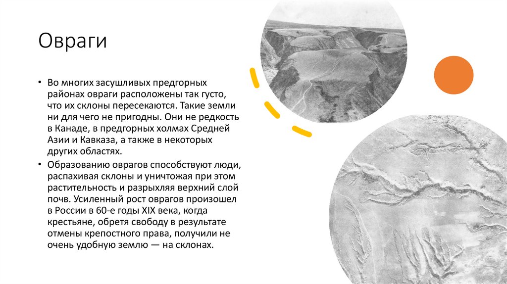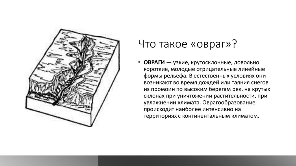 • ОВРАГИ — узкие, крутосклонные, довольнокороткие, молодые отрицательные линейные