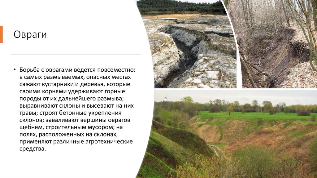 • Борьба с оврагами ведется повсеместно:в самых размываемых, опасных местах