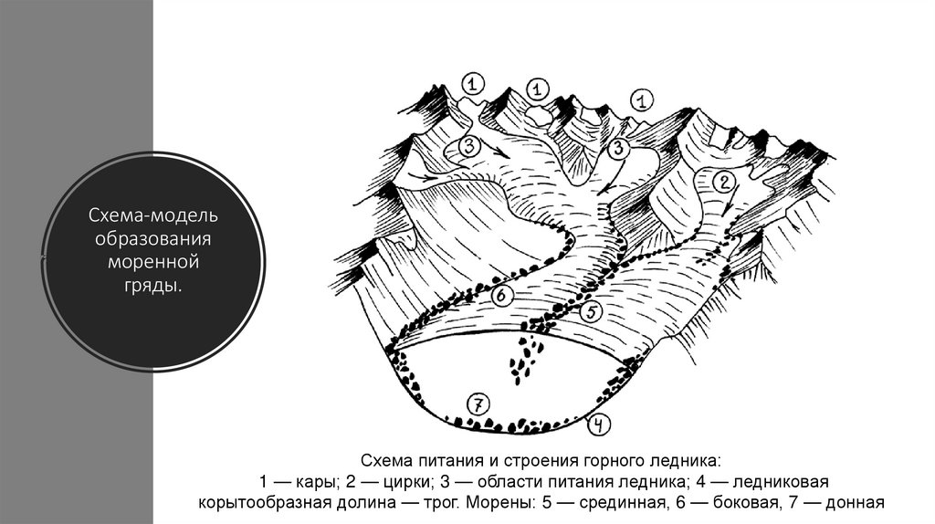 корытообразная долина — трог. Морены: 5 — срединная, 6 — боковая, 7 — донная