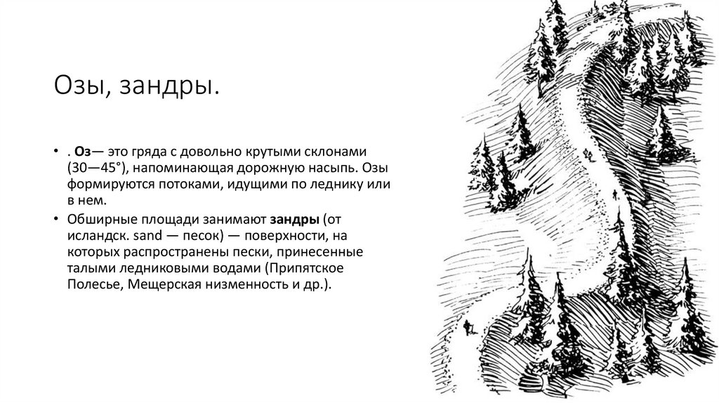 • . Оз— это гряда с довольно крутыми склонами(30—45°), напоминающая дорожную насыпь. Озы