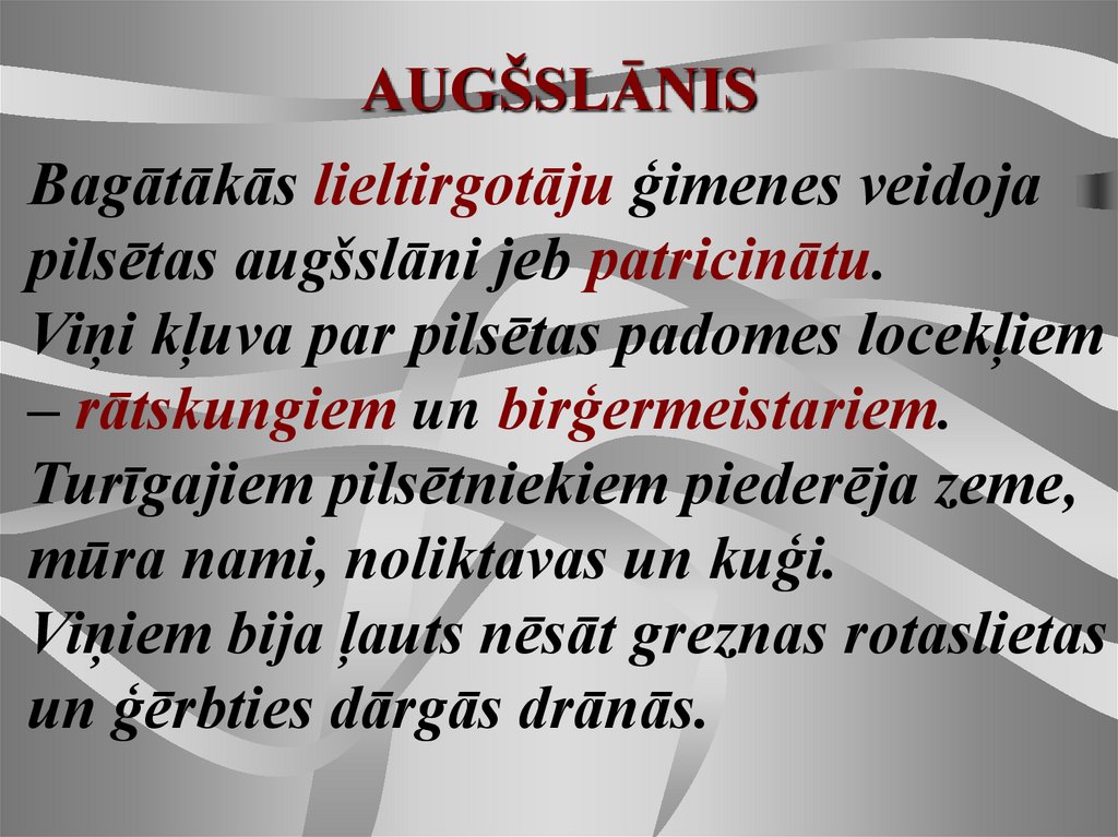 Bagātākās lieltirgotāju ģimenes veidojapilsētas augšslāni jeb patricinātu.