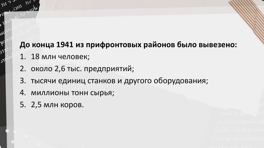 До конца 1941 из прифронтовых районов было вывезено:1. 18 млн человек;