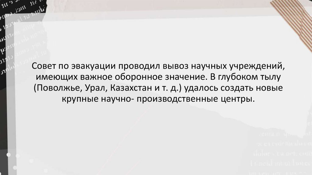 Совет по эвакуации проводил вывоз научных учреждений,имеющих важное оборонное значение. В глубоком тылу