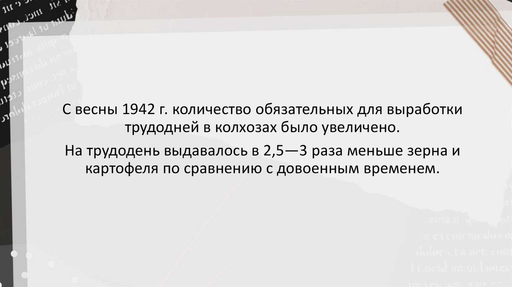 С весны 1942 г. количество обязательных для выработкитрудодней в колхозах было увеличено.