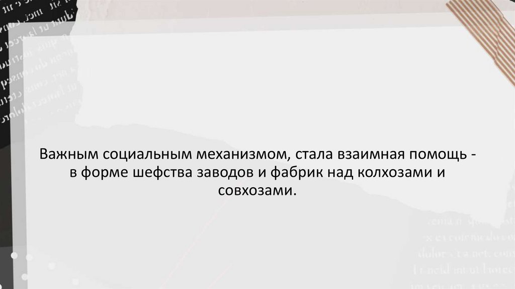 Важным социальным механизмом, стала взаимная помощь в форме шефства заводов и фабрик над колхозами исовхозами.