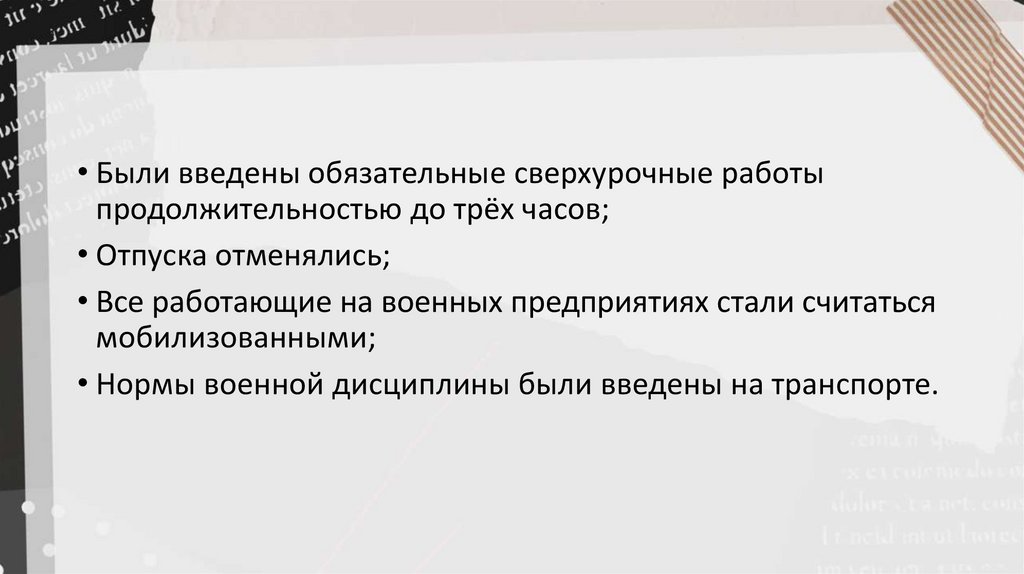 • Были введены обязательные сверхурочные работыпродолжительностью до трёх часов;