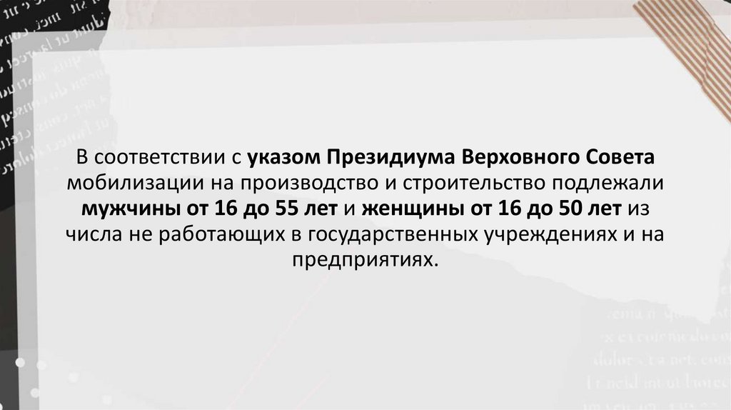 В соответствии с указом Президиума Верховного Советамобилизации на производство и строительство подлежали