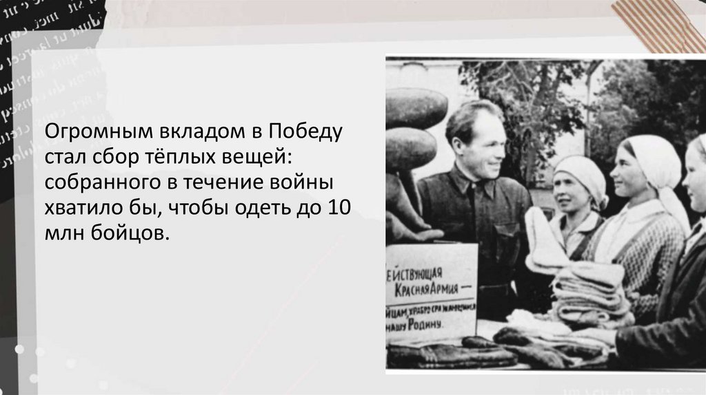 Огромным вкладом в Победустал сбор тёплых вещей: