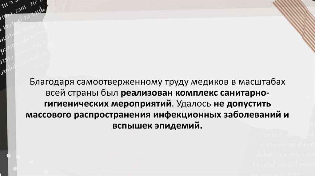 Благодаря самоотверженному труду медиков в масштабахвсей страны был реализован комплекс санитарногигиенических мероприятий. Удалось не допустить