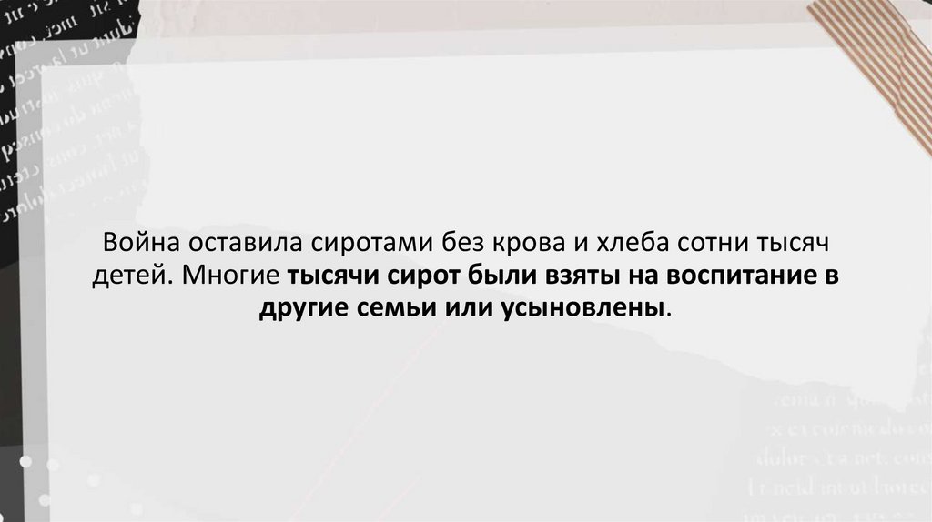 Война оставила сиротами без крова и хлеба сотни тысячдетей. Многие тысячи сирот были взяты на воспитание в