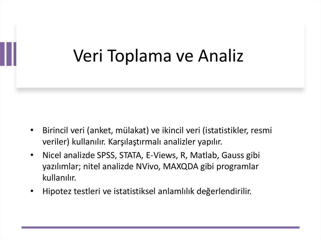 • Birincil veri (anket, mülakat) ve ikincil veri (istatistikler, resmiveriler) kullanılır. Karşılaştırmalı analizler yapılır.