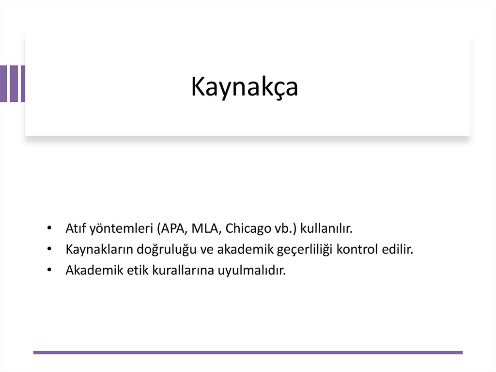• Atıf yöntemleri (APA, MLA, Chicago vb.) kullanılır.• Kaynakların doğruluğu ve akademik geçerliliği kontrol edilir.