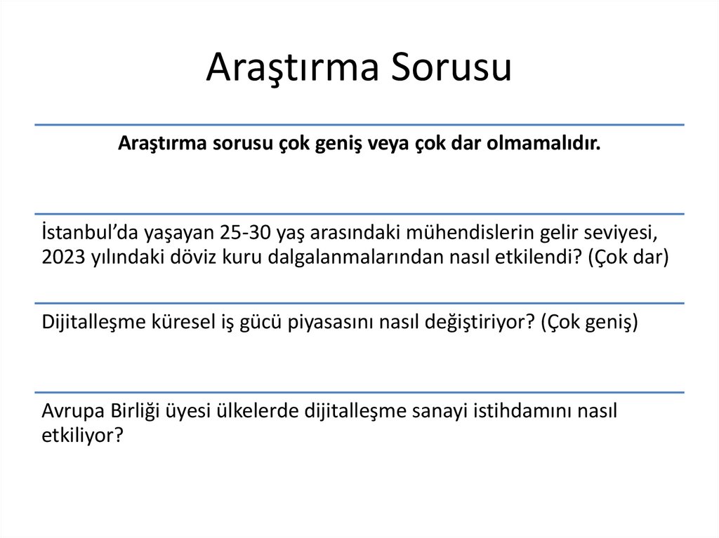 Araştırma sorusu çok geniş veya çok dar olmamalıdır.İstanbul’da yaşayan 25-30 yaş arasındaki mühendislerin gelir seviyesi,