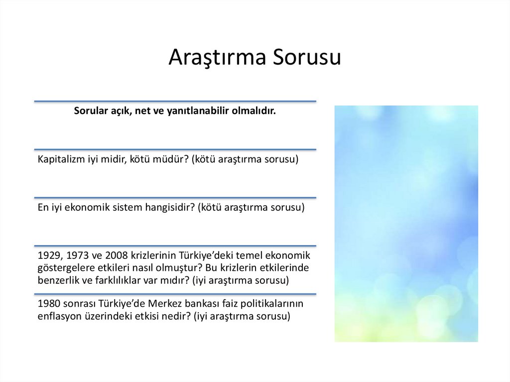 Sorular açık, net ve yanıtlanabilir olmalıdır.Kapitalizm iyi midir, kötü müdür? (kötü araştırma sorusu)